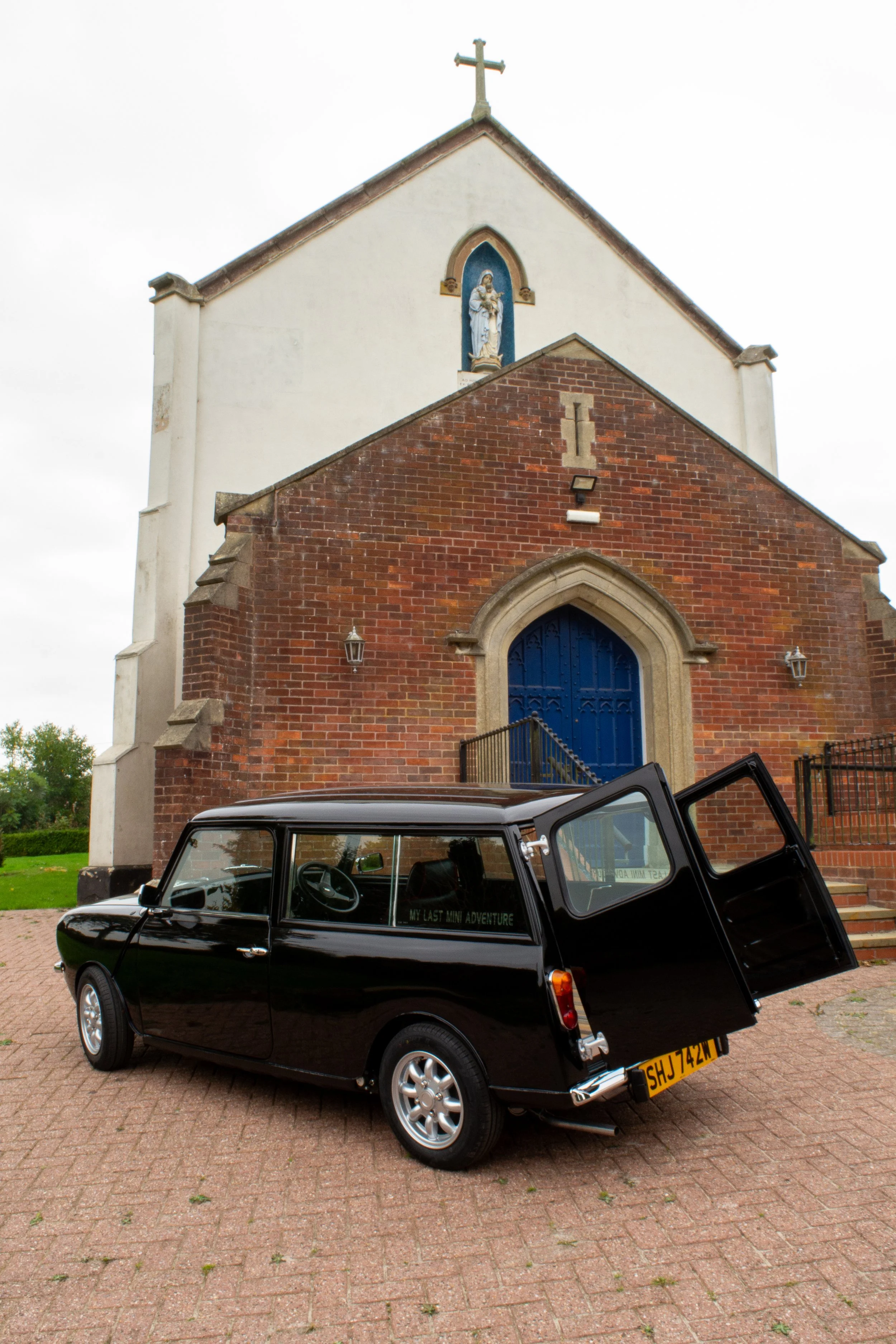 A classic mini hearse parked in front of a church. The mini is a 1980 classic mini clubman hearse. View fullsize