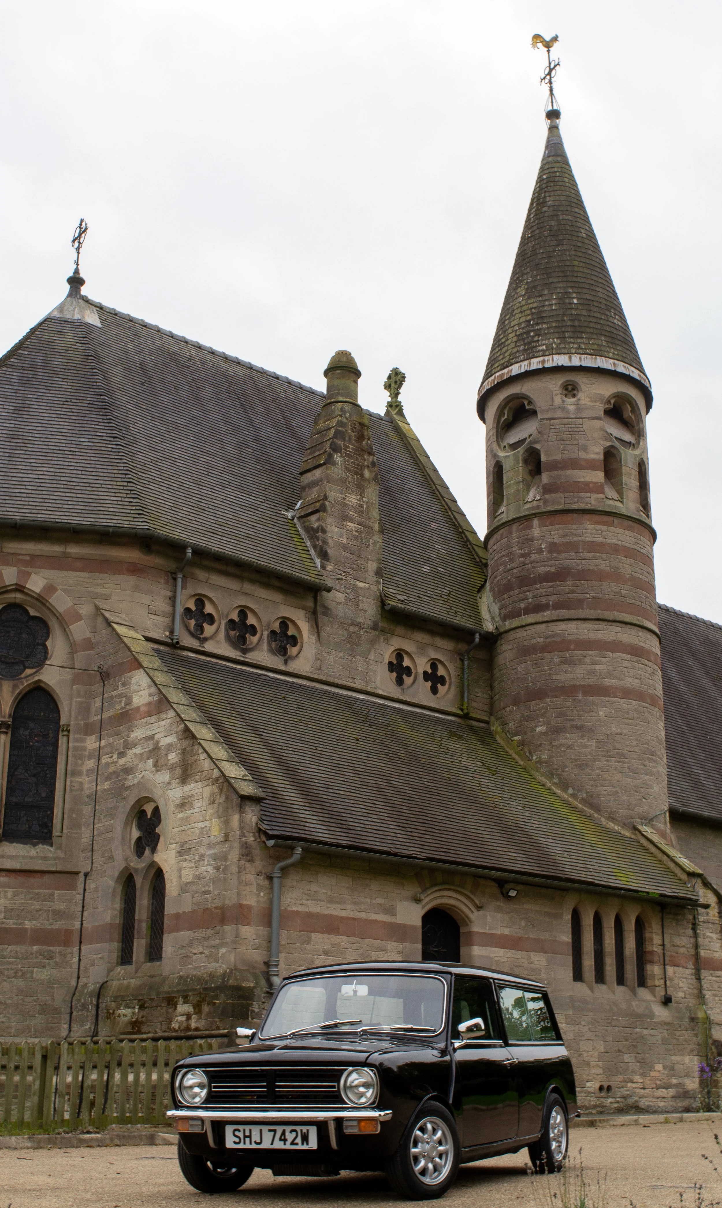 A 1980 Mini Clubman Hearse parked outside an old stone church with stained glass windows and a tiled roof, surrounded by trees.