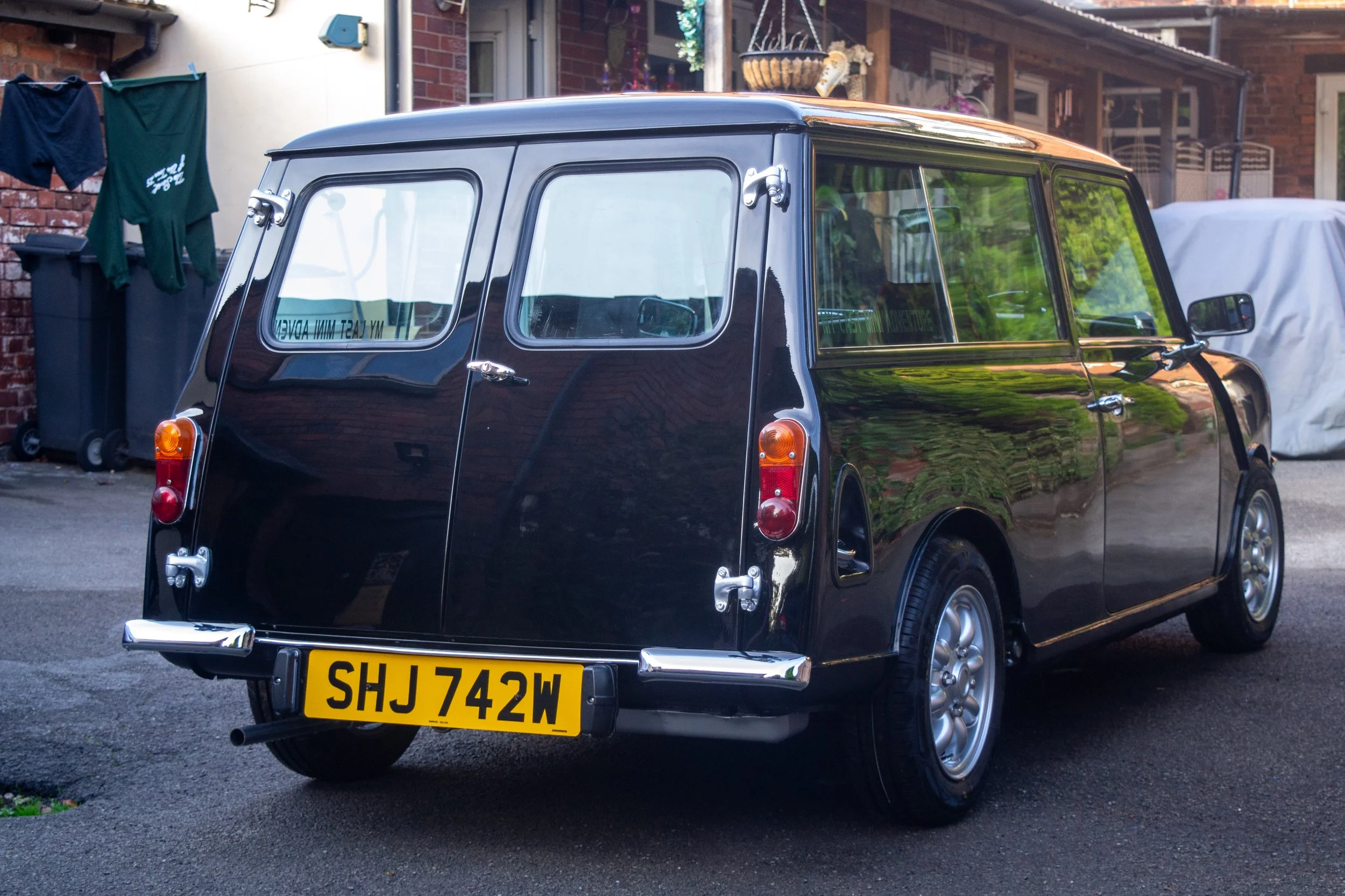 A 1980 Mini Clubman Hearse car parked showing the car with the doors closed.